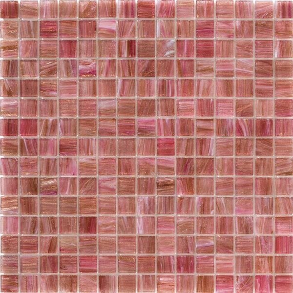 Fused glass mosaic consisting of chips made from glass mixed with glaze granules and/or chips of glass-goldstone crystal (a semiprecious gemstone). Aurore is a mosaic comprising bevelled square chips 4 mm thick, in sizes 20mm x 20mm, mounted on glass fibre mesh to form a sheet of 327mm x 327mm in which the chips are about 1.9 mm apart.