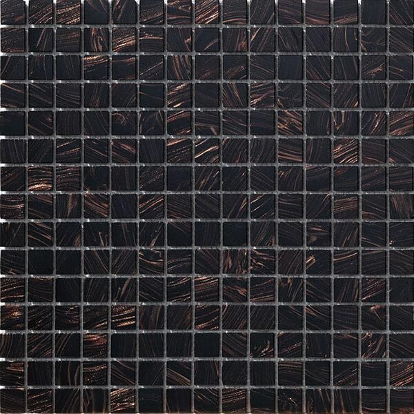 Fused glass mosaic consisting of chips made from glass mixed with glaze granules and/or chips of glass-goldstone crystal (a semiprecious gemstone). Aurore is a mosaic comprising bevelled square chips 4 mm thick, in sizes 20mm x 20mm, mounted on glass fibre mesh to form a sheet of 327mm x 327mm in which the chips are about 1.9 mm apart.