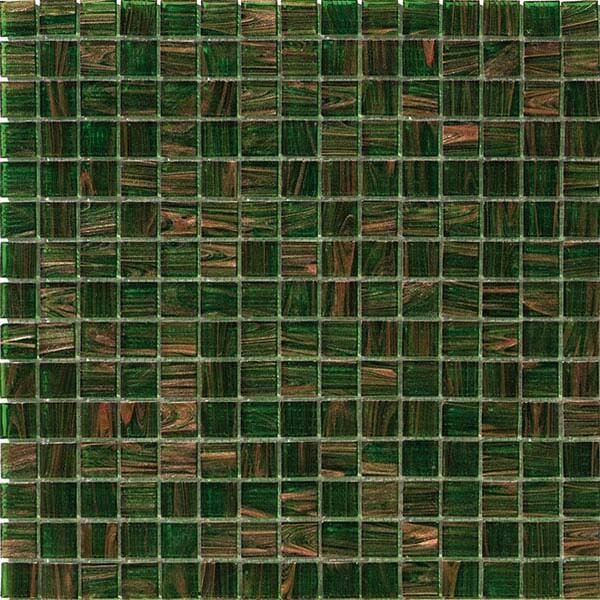Fused glass mosaic consisting of chips made from glass mixed with glaze granules and/or chips of glass-goldstone crystal (a semiprecious gemstone). Aurore is a mosaic comprising bevelled square chips 4 mm thick, in sizes 20mm x 20mm, mounted on glass fibre mesh to form a sheet of 327mm x 327mm in which the chips are about 1.9 mm apart.