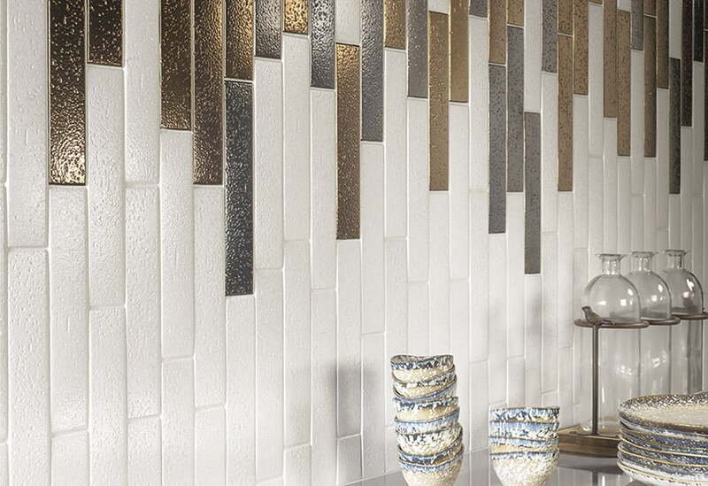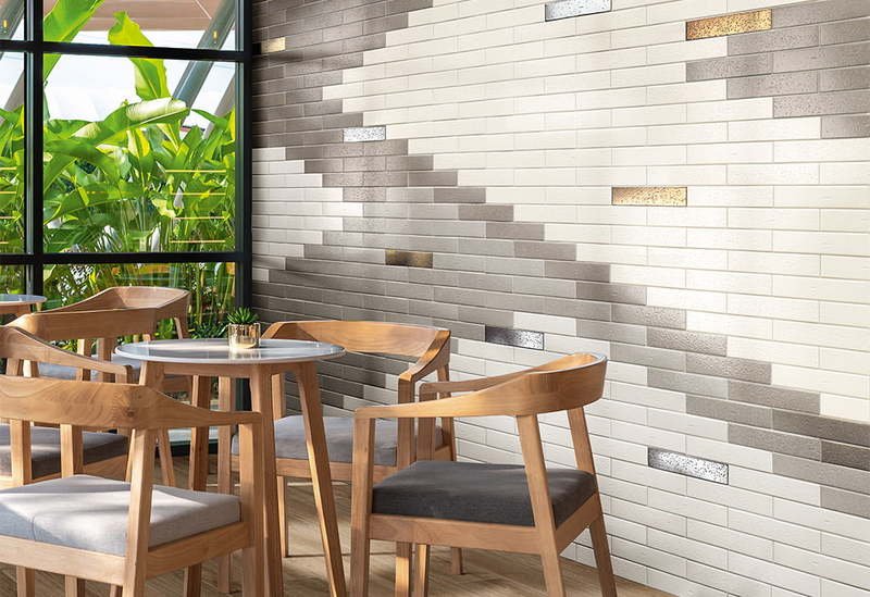 Muretto is an extremely glossy porcelain tile in metrotile format. Its neutral tones are mixed with very natural metallics such as gold, allowing you to create creative and luxurious compositions, ideal for private or commercial spaces with a lot of personality.
