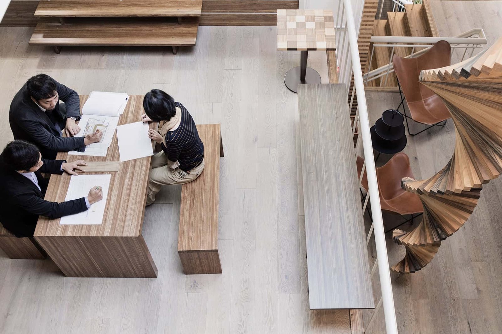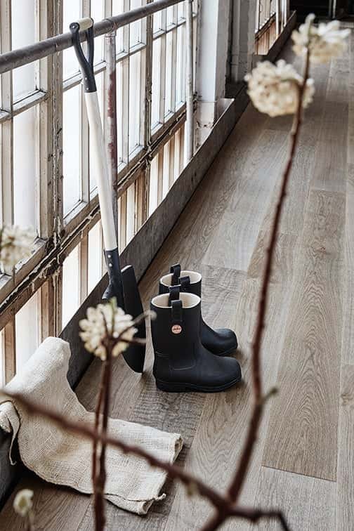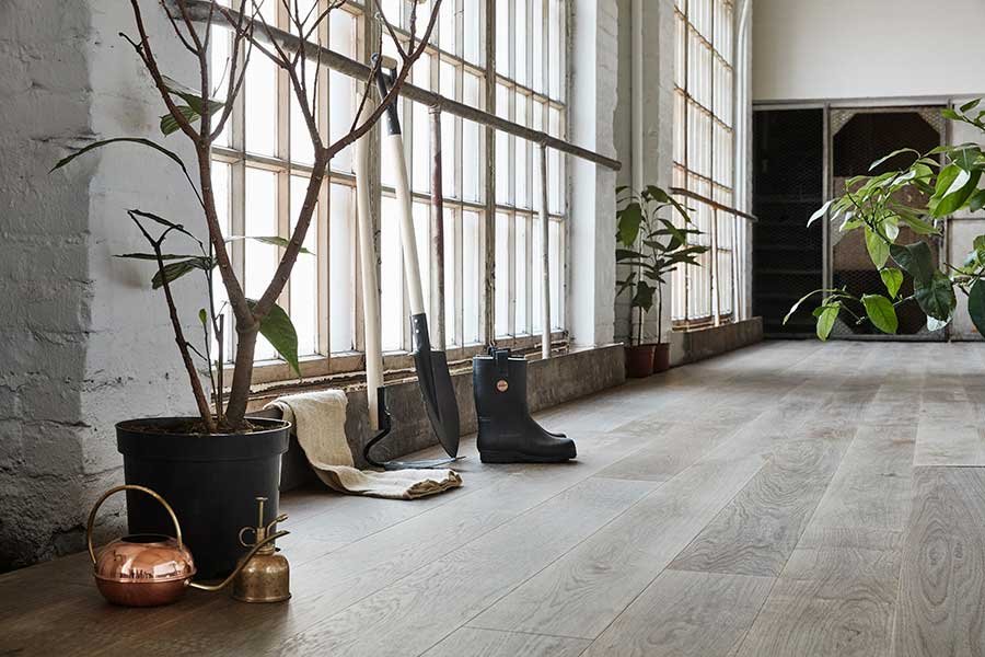 A greyish brown tone. It creates a balanced and peaceful atmosphere for the interior while allowing the play of light and shadow on the oak’s natural surface pattern.