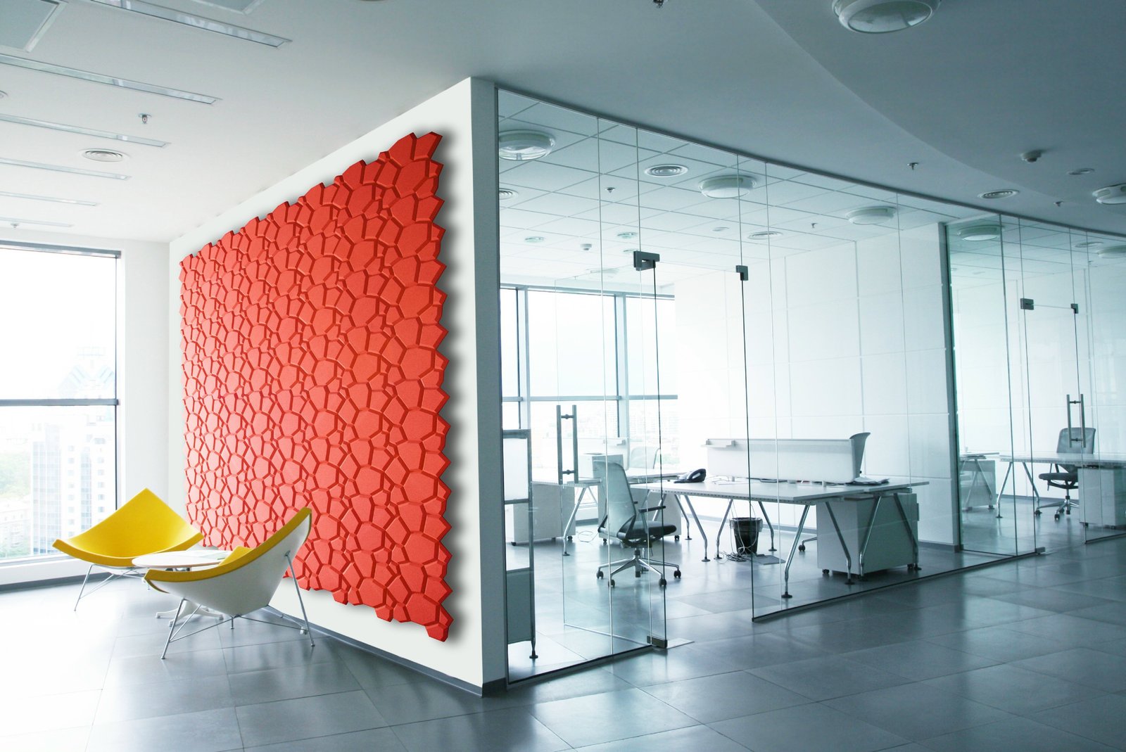 The shape of BEEHIVE results from the union of different geometrical planes that grow in an organic way. It is a progression from a basic honeycomb, at once natural and contemporary. The pattern appears to move, yet it is balanced, giving dynamism, energy, and emotion to the environment.