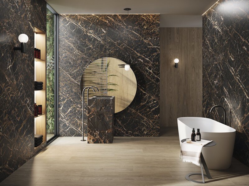 Portoro, a collection with its own distinct personality, draws inspiration from one of nature's most elegant marbles. As a naturally sourced stone, this ceramic presents a base in a deep crystalline black, endowed with captivating elegance and an overwhelming personality. Despite its intense blackness, the beauty of Portoro Gold lies in the perfect harmony between numerous golden veins, and delicate white grooves that intertwine to form a remarkably beautiful image.
