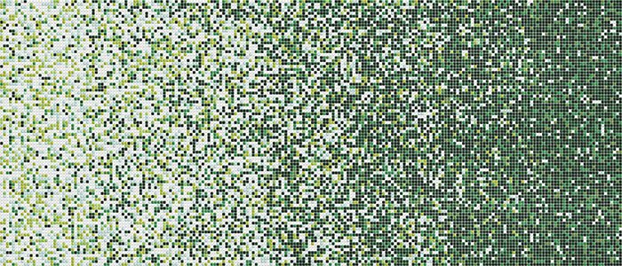 Glass mosaic comprising chips from the Colore collections (Vetrina, Concerto, Perle, Aurore, Tanticolori, Doro), mounted on fibreglass mesh. Each module is a gradual composition of mixed sheets, made up of chips in varying percentages and with random arrangement.